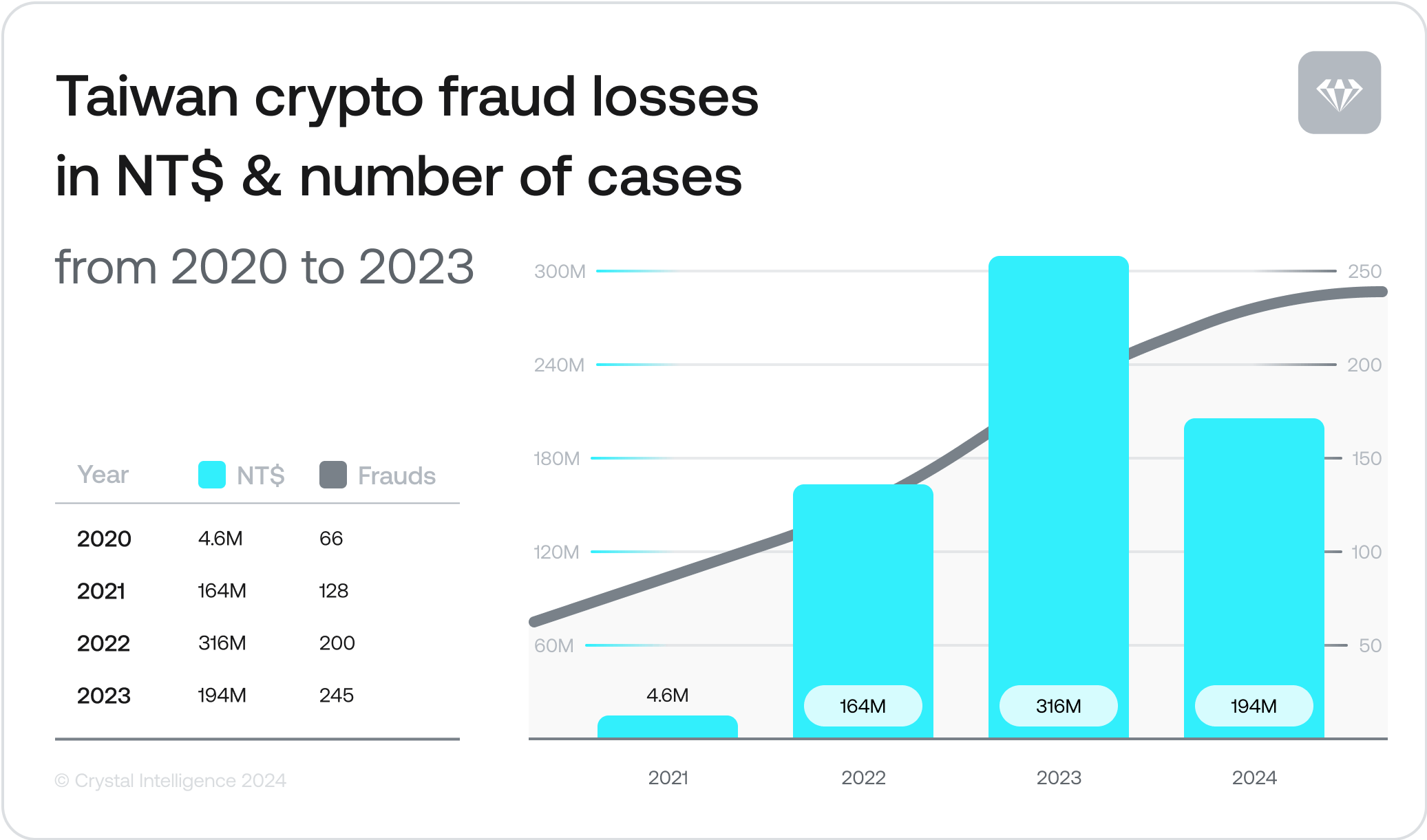 Taiwan’s financial losses to crypto-related fraud cases from 2020 to 2023 have totalled almost NT$679M. Although the monetary losses dropped in 2023, the number of crypto-related fraud cases has continued to rise at an alarming rate: from just 66 in 2020 to 245 in 2023.