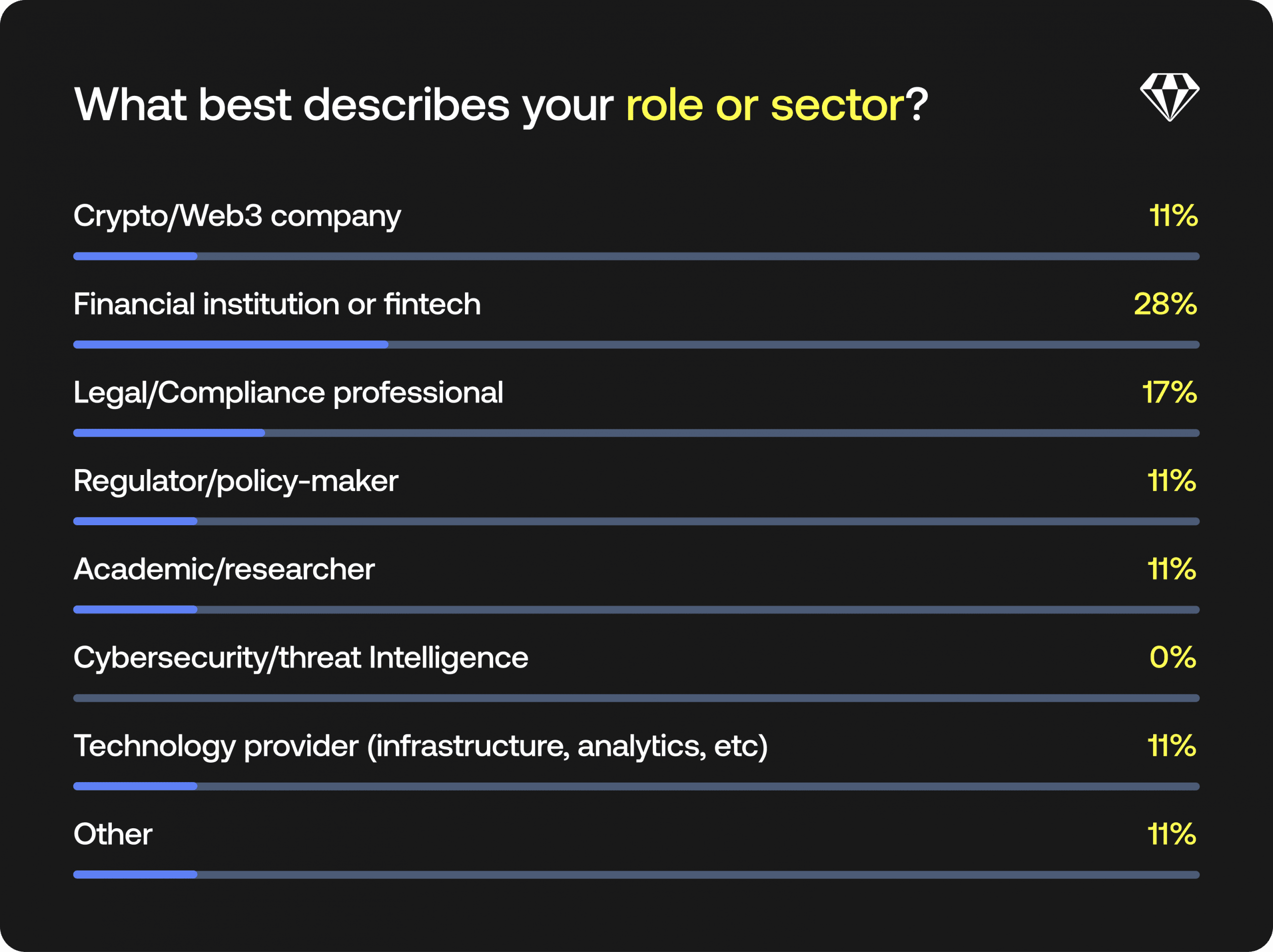Fintech representatives dominated with 28%, followed by legal and compliance professionals (17%). Strikingly,no one in the audience came from the cybersecurity or threat intelligence sector.