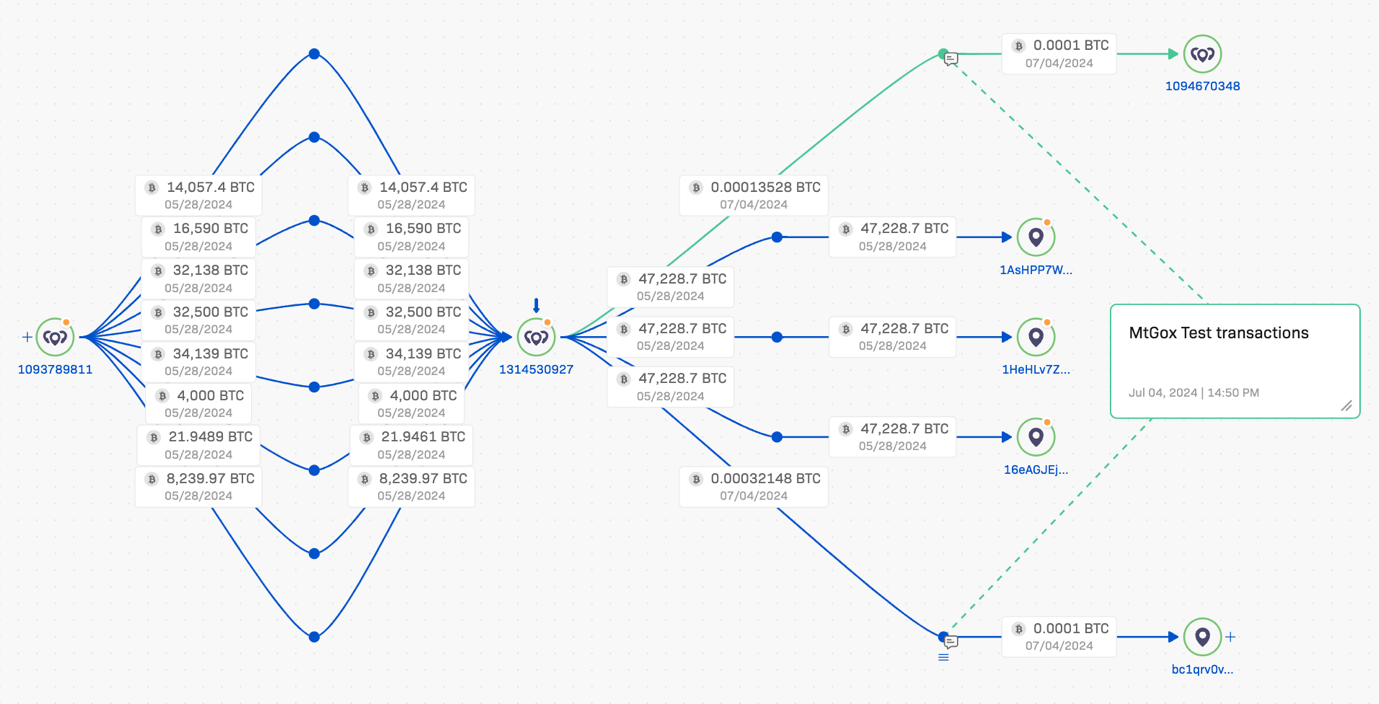 Above: Transactions made on July 4, 2024 show the test transactions made from MtGox wallets.