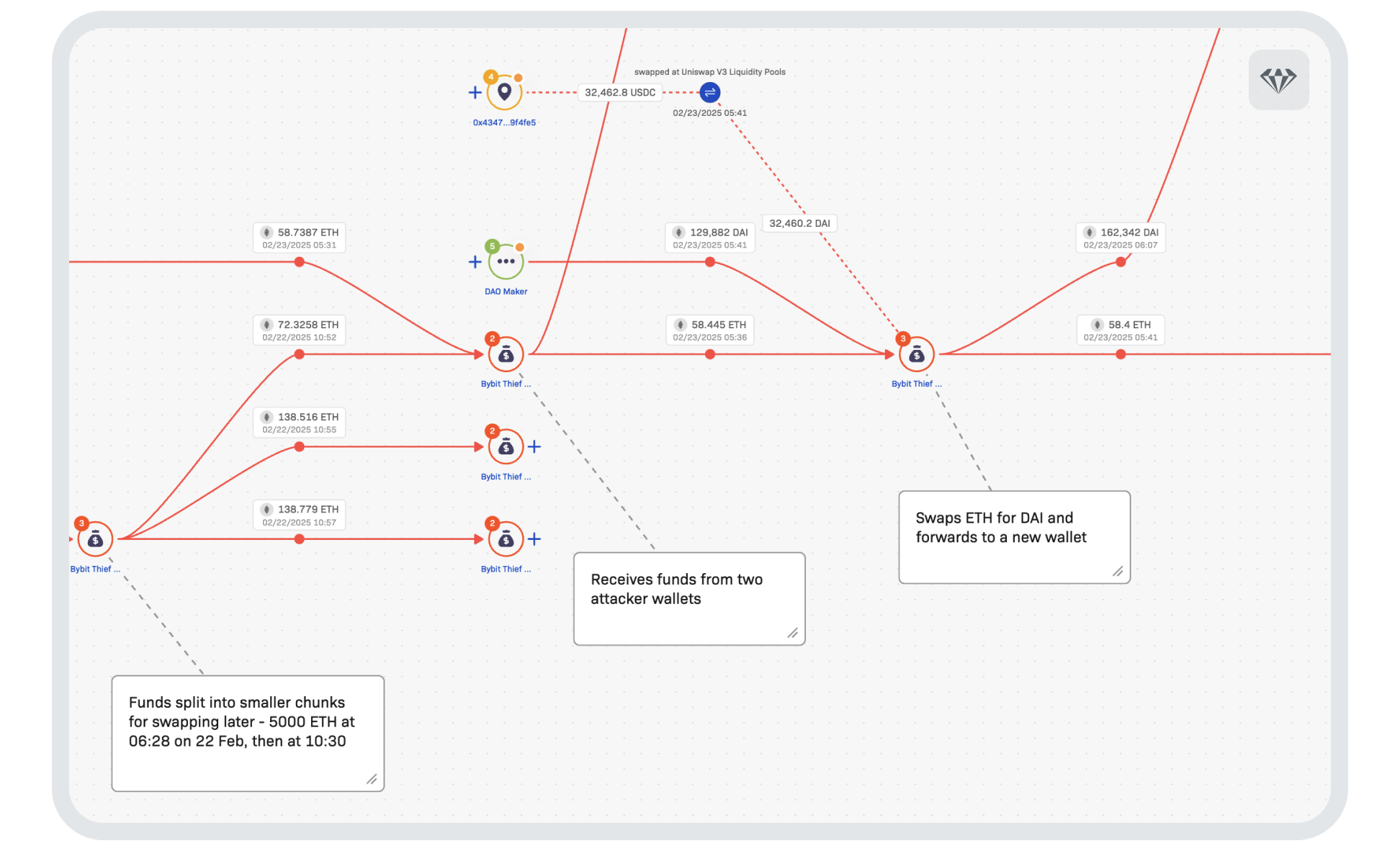 As an example of this case’s complexity, the graphic below shows one of the preliminary stages the attacker conducts before moving the funds to a new blockchain. In it, funds are split into smaller amounts and swapped for DAI, a censorship-resistant stablecoin: