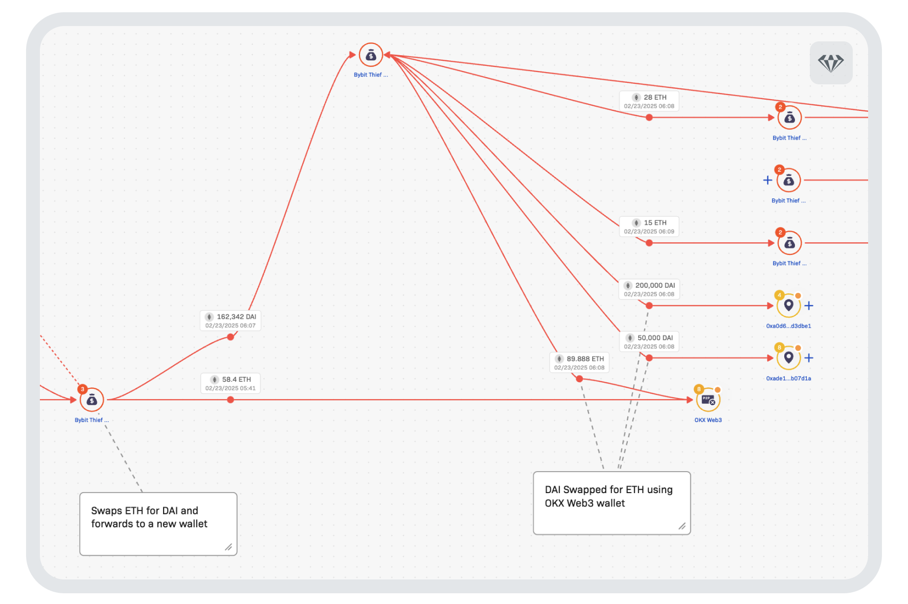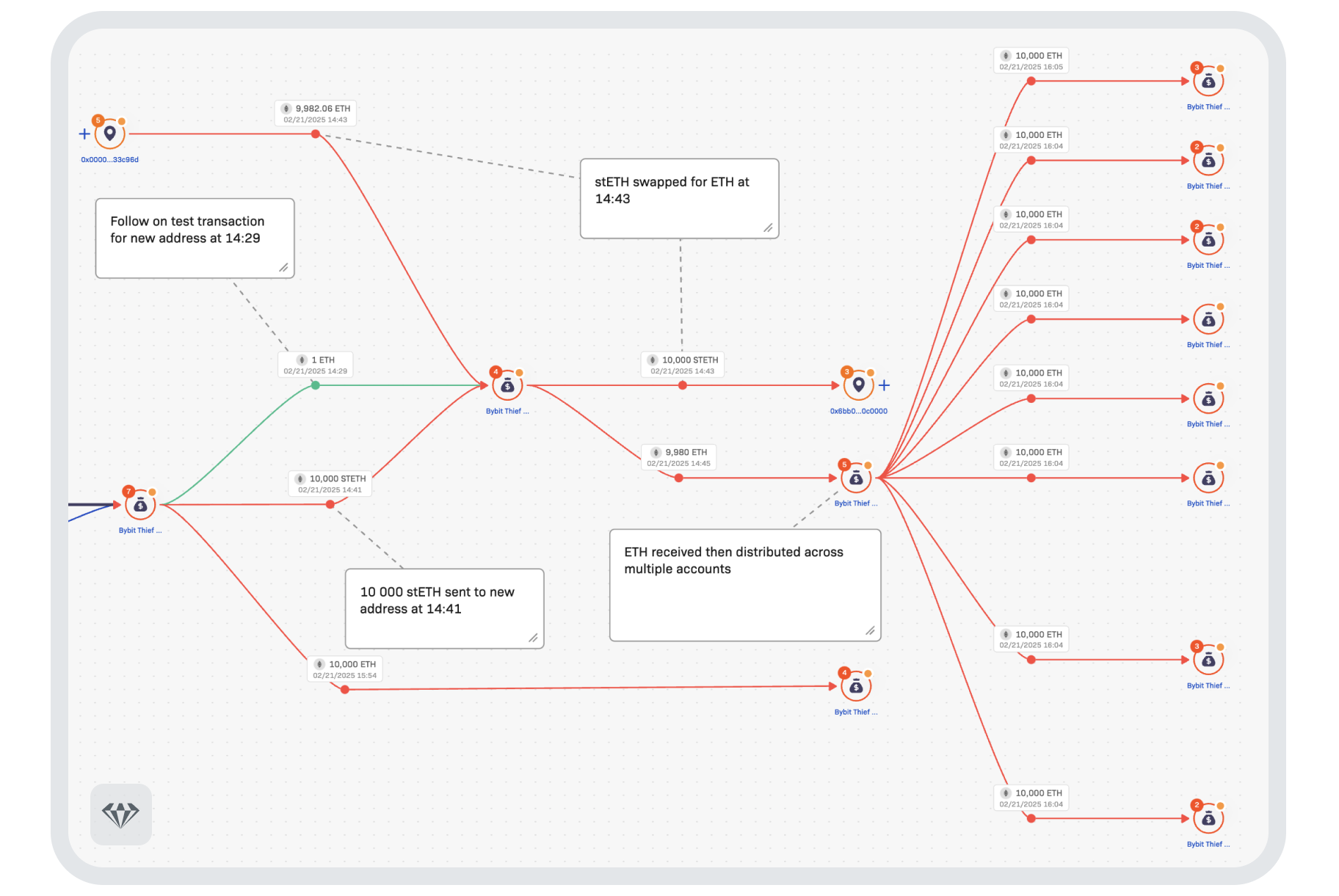 Crystal responded to this unique event by standing up a crisis response team, which is working tirelessly around the clock to track developments and fund movements. So far, our expert team has labeled over 1,000 addresses involved in the case, a number that is growing with additional data sources provided by our industry partners and Bybit themselves.