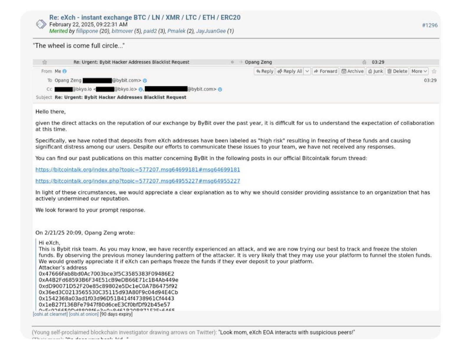Bybit’s choice to stop user withdrawals to eXch led to anger on the BitcoinTalk forum. eXch has also refused to support Bybit because it labeled the service as high-risk. The level of collusion between eXch and the thieves is not known, but this public statement is unlikely to convince many that eXch are not involved in some capacity.