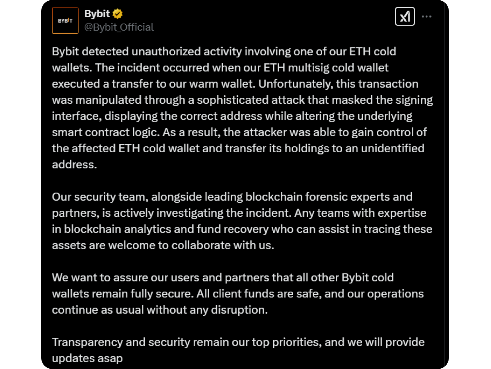 Initial reports of the incident began to surface almost an hour later; with confirmation from Bybit posted to the company’s X account at 15:51.