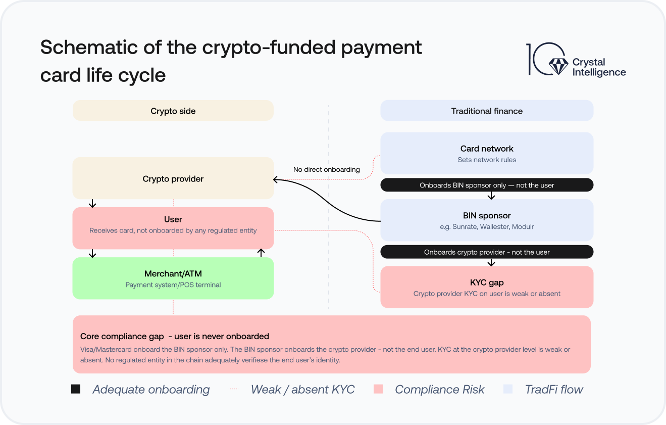 Issuing banks and BIN sponsors face potential financial crime exposure when onboarding or transaction monitoring controls are insufficient. Card issuers typically monitor card transactions but have limited or no visibility into the crypto transactions used to fund card balances. This is where the compliance gap materializes: funds originating from high-risk sources can enter the traditional payment system after crypto-to-fiat conversion, and the risk does not travel with them.