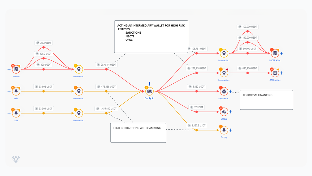 After reaching Entity A–controlled wallets, portions of the traced funds are transferred onward through additional intermediaries. In several observed paths, funds move from Entity A to wallets that later interact with sanctioned entities, gambling platforms, and wallets linked to terrorism financing reports.
