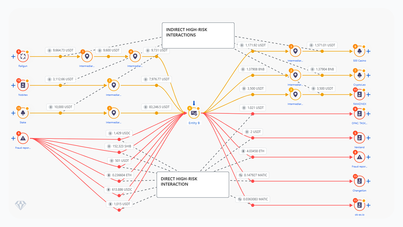 Further blockchain tracing identified direct interactions between Entity B–linked wallets and several high-risk entities. The observed transaction patterns are consistent with potential off-ramping activity, in which crypto originating from higher-risk sources is consolidated within service wallets before being converted to fiat and spent via card infrastructure.