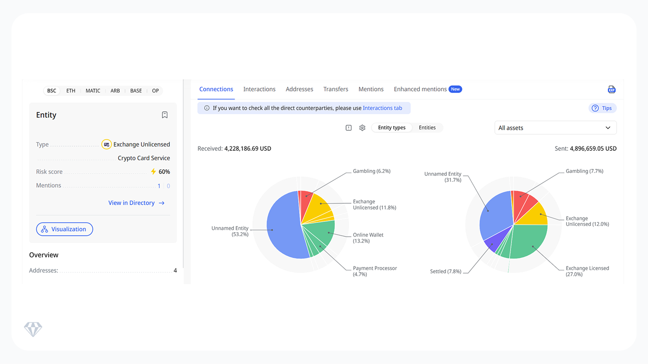 To better understand the flow of funds through the platform, Crystal Intelligence conducted an on-chain tracing analysis of transactions associated with Entity A-linked wallets. The analysis aimed to identify key counterparties, transaction patterns, and potential exposure to higher-risk entities. The results show interactions with entities associated with elevated financial crime risk, including sanctioned entities, gambling platforms, and fraud-linked wallets.