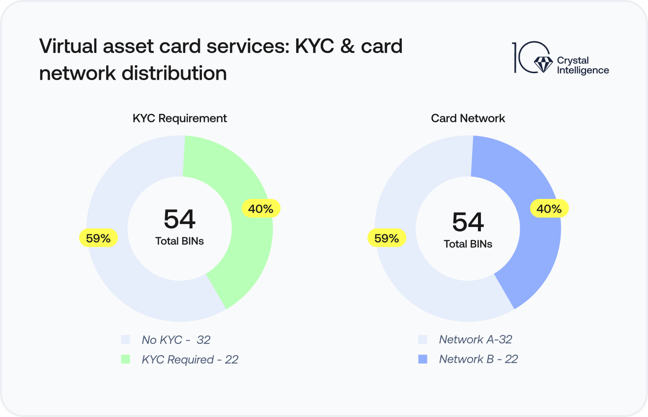 Crystal’s investigation identified three BIN sponsors across multiple jurisdictions supporting four crypto-funded card services with limited or no KYC requirements across two major card networks. As with similar structures, issuing entities do not maintain visibility into end-user onboarding, limiting their ability to assess identity-related risks.