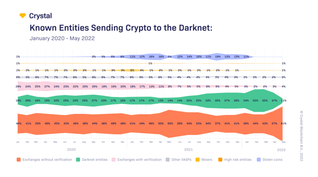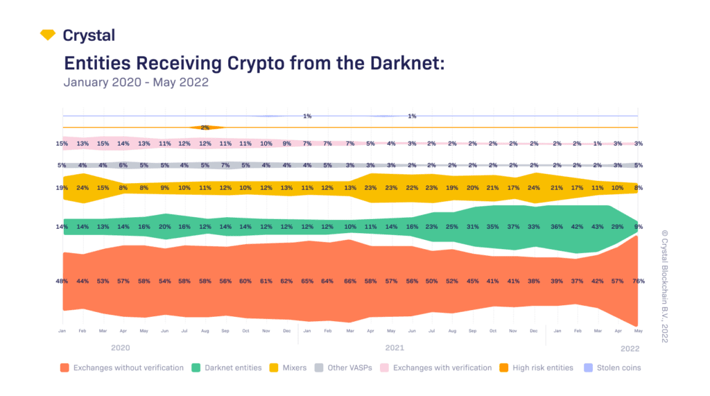 After the Hydra closure, the amount of money received from Darknet entities decreased to 11% in May 2022 due to the growth of amounts received from Exchanges without KYC. But we expect amounts to get back in Darknet internal usage after new dark marketplaces substitute Hydra.