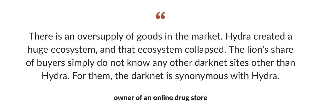 Not long after the closure of Hydra in April 2022, there were several offers made to the founders to sell its affiliated forum according to relevant Telegram channels “citing their own sources.” This reported sale would be important to the darknet community, given their few spaces for communication, but also potentially for those monitoring darknet crimes, should there be a slip up in logistics in the handover. The forum database would also be relevant to both the new buyers and to those looking to take down the darknet, should a relevant mishap happen.