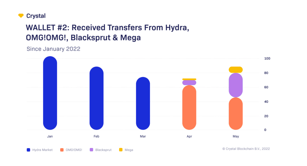 Both of the addresses have a significant number of deposits received from analyzed Darknet entities – from 80 to 1000 transfers per month. We see an obvious switching in where they receive their funds from – going from Hydra MarketPlace to OMG!OMG! and Blacksprut.