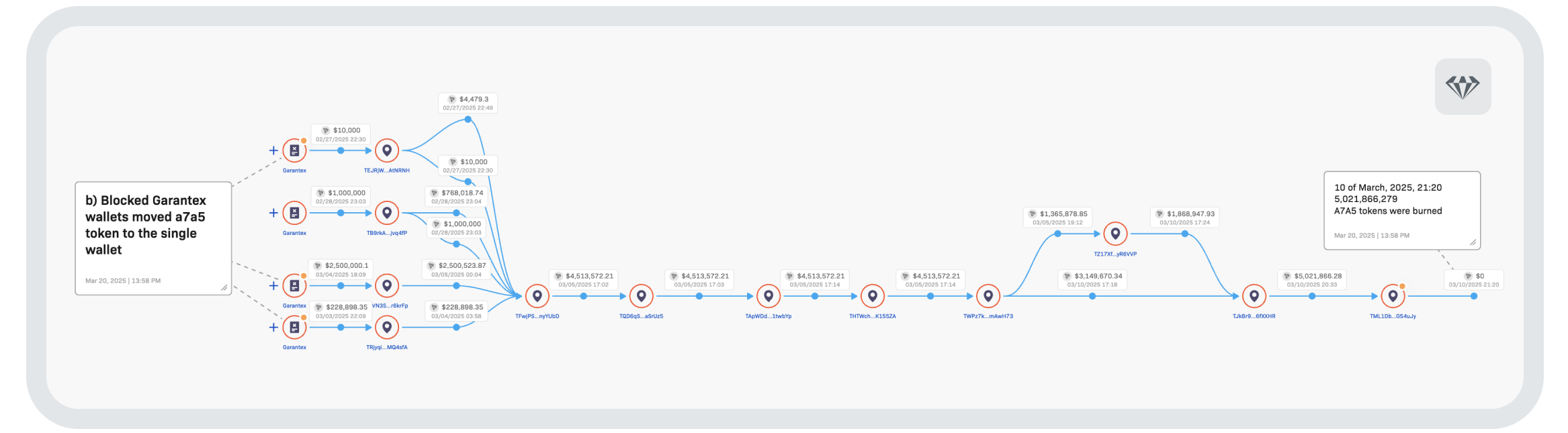 We were able to show how the blocked Garantex wallet moved the A7A5 tokens to a single wallet. By March 10, 21.20pm UTC, nearly $60 million had been burned.