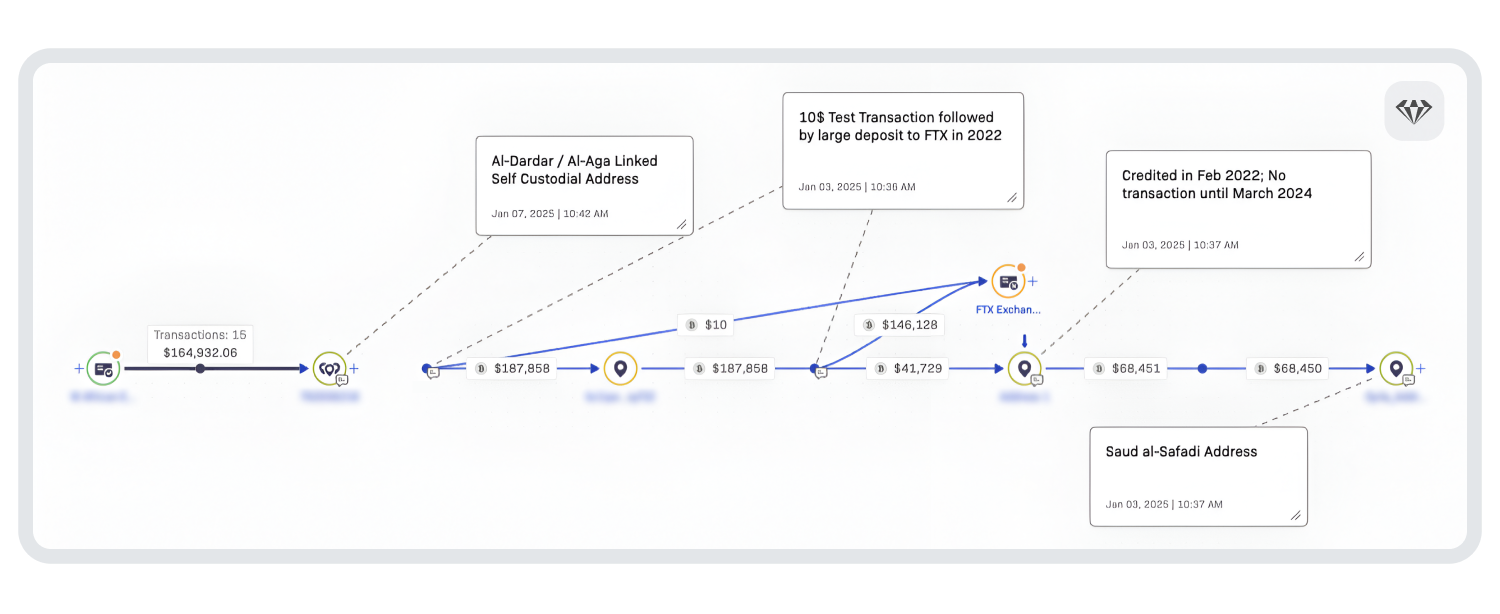 While the document alone is revealing in that it identifies the source of the individuals’ funds and the broker, we were able to enrich the investigation by looking at the activity on-chain using Crystal Expert.