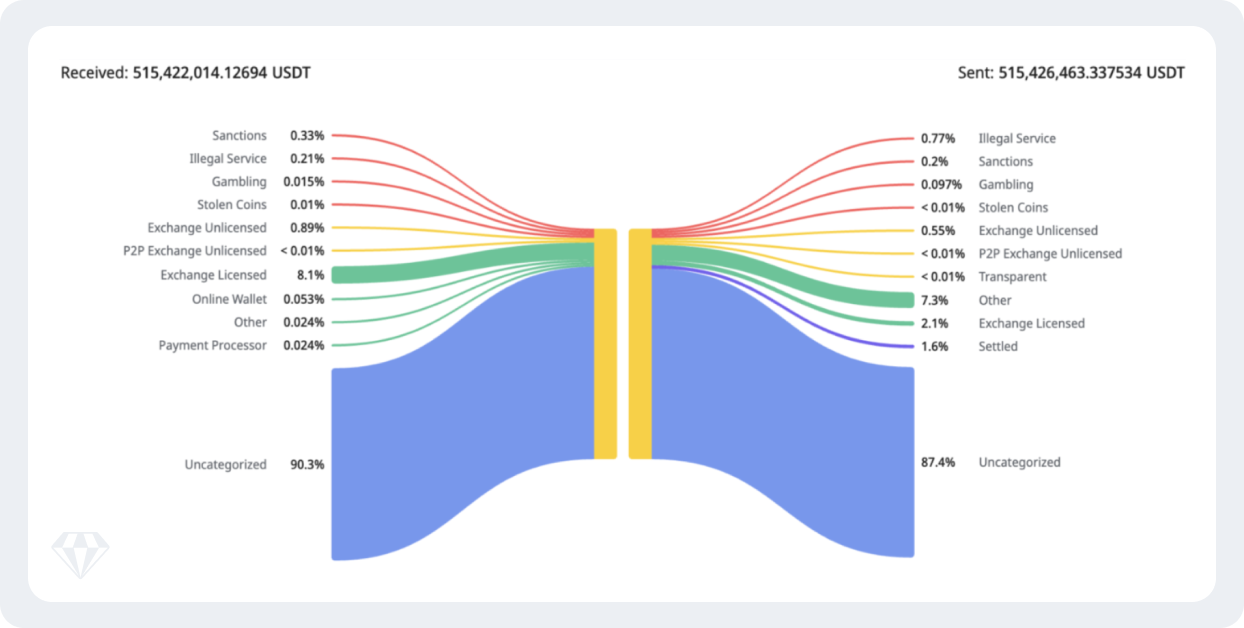 • Remaining 6% from mixed categories including illegal services (0.4%), sanctioned entities (0.11%), and licensed exchanges (5.3%)