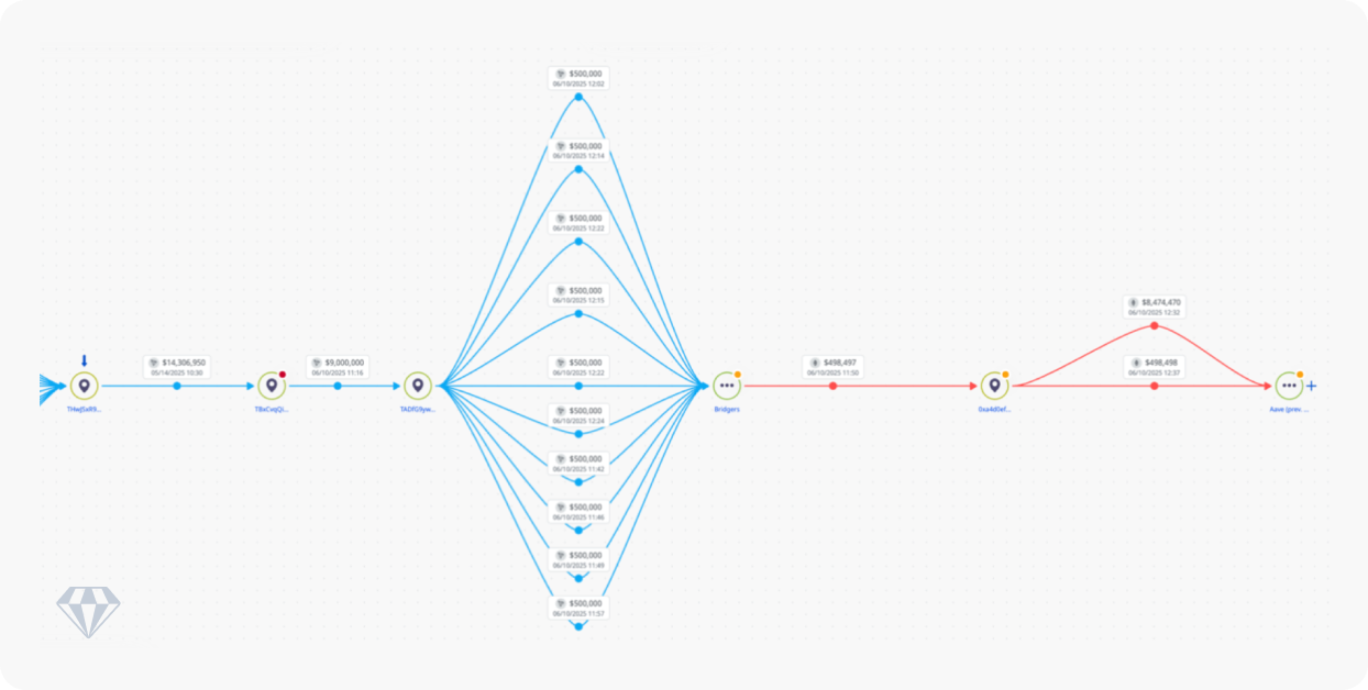 • Additional analysis indicates systematic routing through Bridgers (cross-chain bridge service) and to Tether-blacklisted wallets