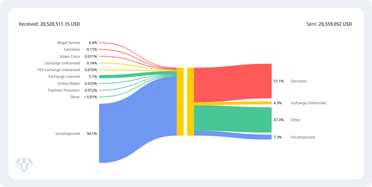 • Origin obscurity combined with high-risk destinations: Funds arrive from 92-94% uncategorized sources, then distribute with precision to sanctions evasion infrastructure. This pattern-untraceable origins, systematic high-risk routing, institutional volumes, compressed timeframes-indicates sophisticated operations at institutional scale.