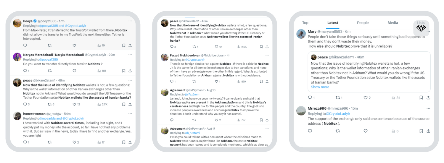 In May 2024, suspicions arose that Nobitex was collaborating with the Iranian government to violate sanctions. These culminated in blockchain analytics platform Arkham Intelligence publishing Nobitex’s wallet information on its publicly available explorer, as well as Codatta – another platform – launching a bounty program to identify wallet addresses linked with Iranian exchanges. This highlighted the activity of Iranian exchanges to a wider audience, a matter not lost on Iranian users. The below interaction on X speaks to the frustration some Iranians feel about the fallout from the roadblocks put up for Nobitex customers: