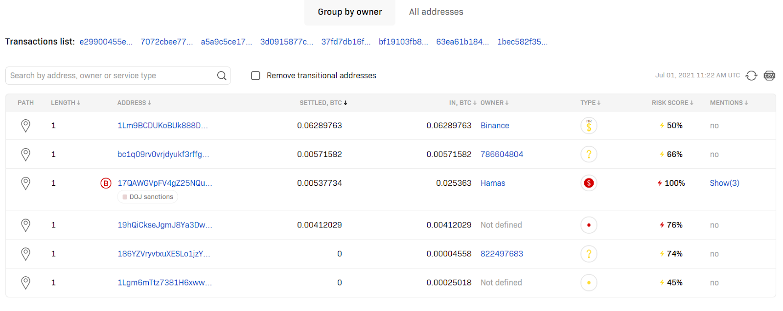If you’d like to filter the information view in the tracking results, you can remove transactional addresses or group the results by owner or addresses. The tracking tool also allows you to update the tracking by adding new transactions and export the tracking results in CSV/PDF format.
