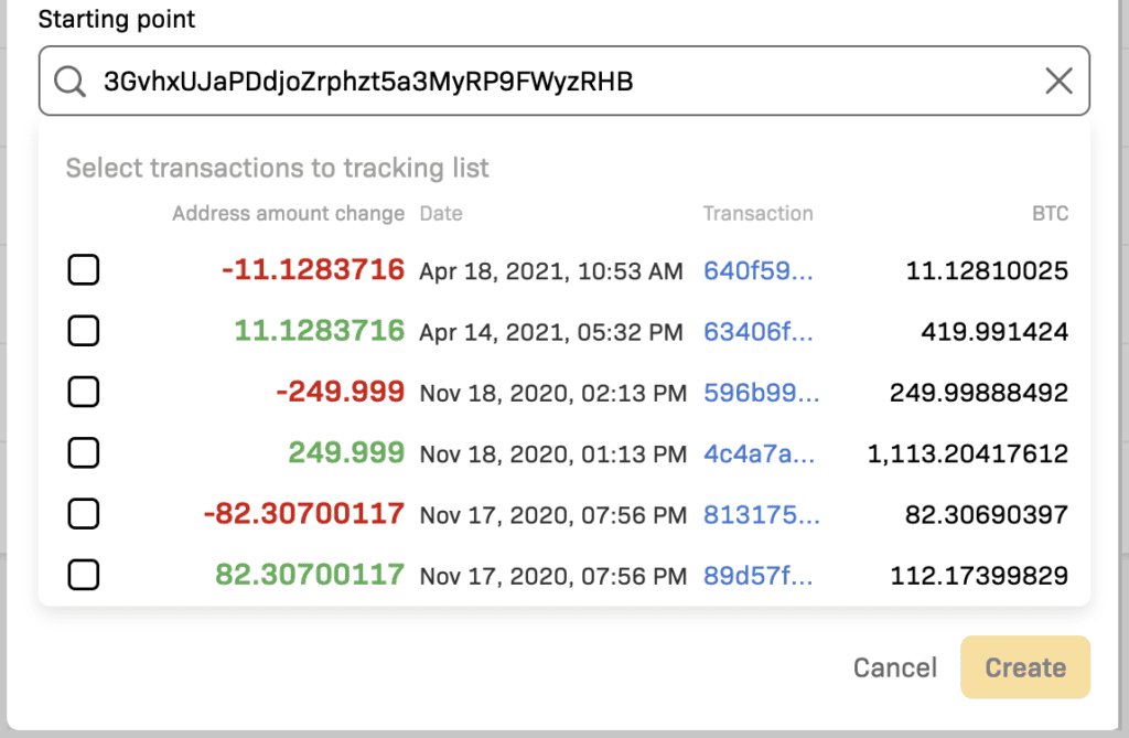 The starting point field is where you provide the transaction hash or address hash to track. When you enter the transaction hash, it is automatically added to the tracking list. When you provide a valid address, Crystal will provide a list of all transactions for that address. The list has checkboxes where you can mark up to ten transactions that you want to track.