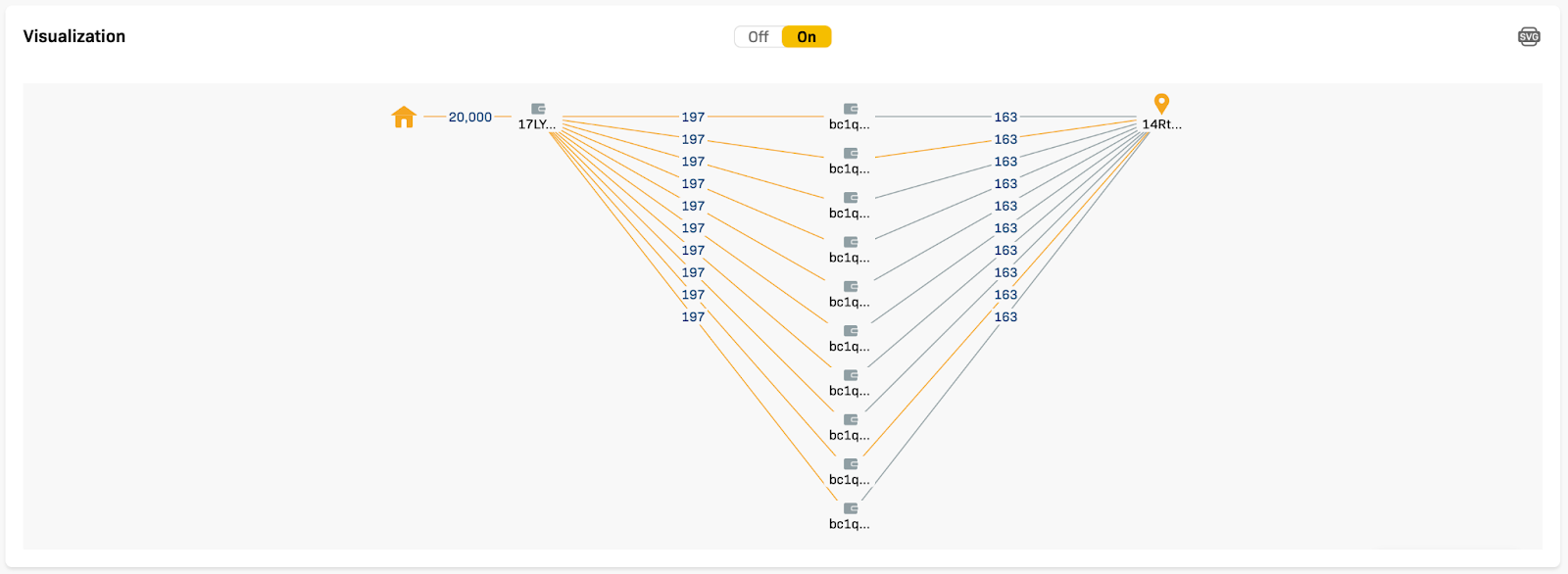 Below the main tracking path is a switch that allows you to turn visualizations off or on if you’d like to visualize the asset flow path of a transaction. You can also zoom the visualization or even save and export the graph as an SVG file.