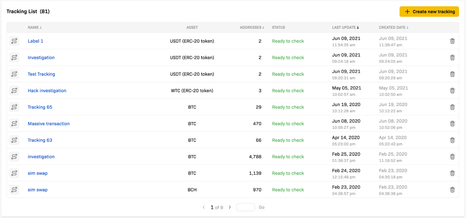 If you had some previously created tracking instances, they will appear on the tracking list. From the list, you can see all trackings alongside the addresses involved, assets, tracking status, date created, and date updated. You can also delete a tracking, edit its label, or open it by clicking on the name.