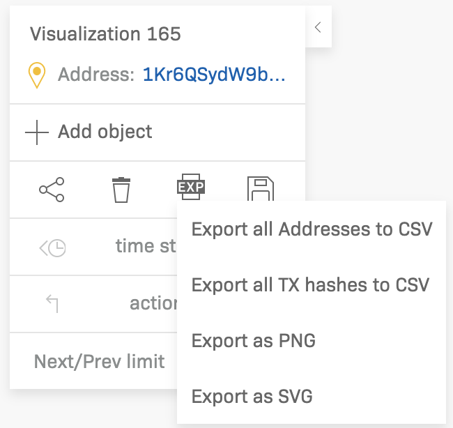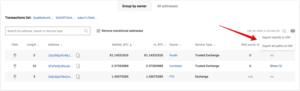 - In the visualizations feature, users can now export details of all addresses and transactions as a CSV file. This add-on allows the user to not only export the visual part but also transaction dates, hash numbers, and address risk scores. This information can then be attached to offer an even more complete data brief for any written reports.