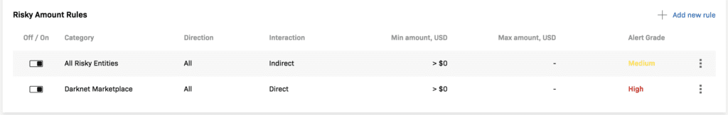 Platform users can now specify types of interaction for risky amounts. The user can select whether to consider direct, indirect, or all interactions for a particular entity type. This is an important tool for compliance officers who need to carefully configure levels of risk.