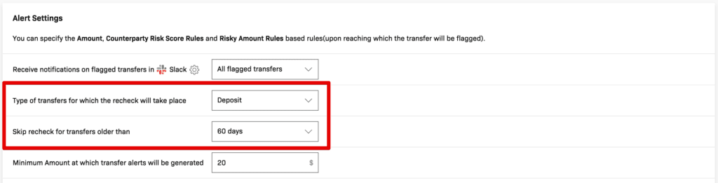 Users can configure the type of transfers that they want to be rechecked (deposits, withdrawals, or all transfers), as well as set a deadline after which transfers will no longer be rechecked.