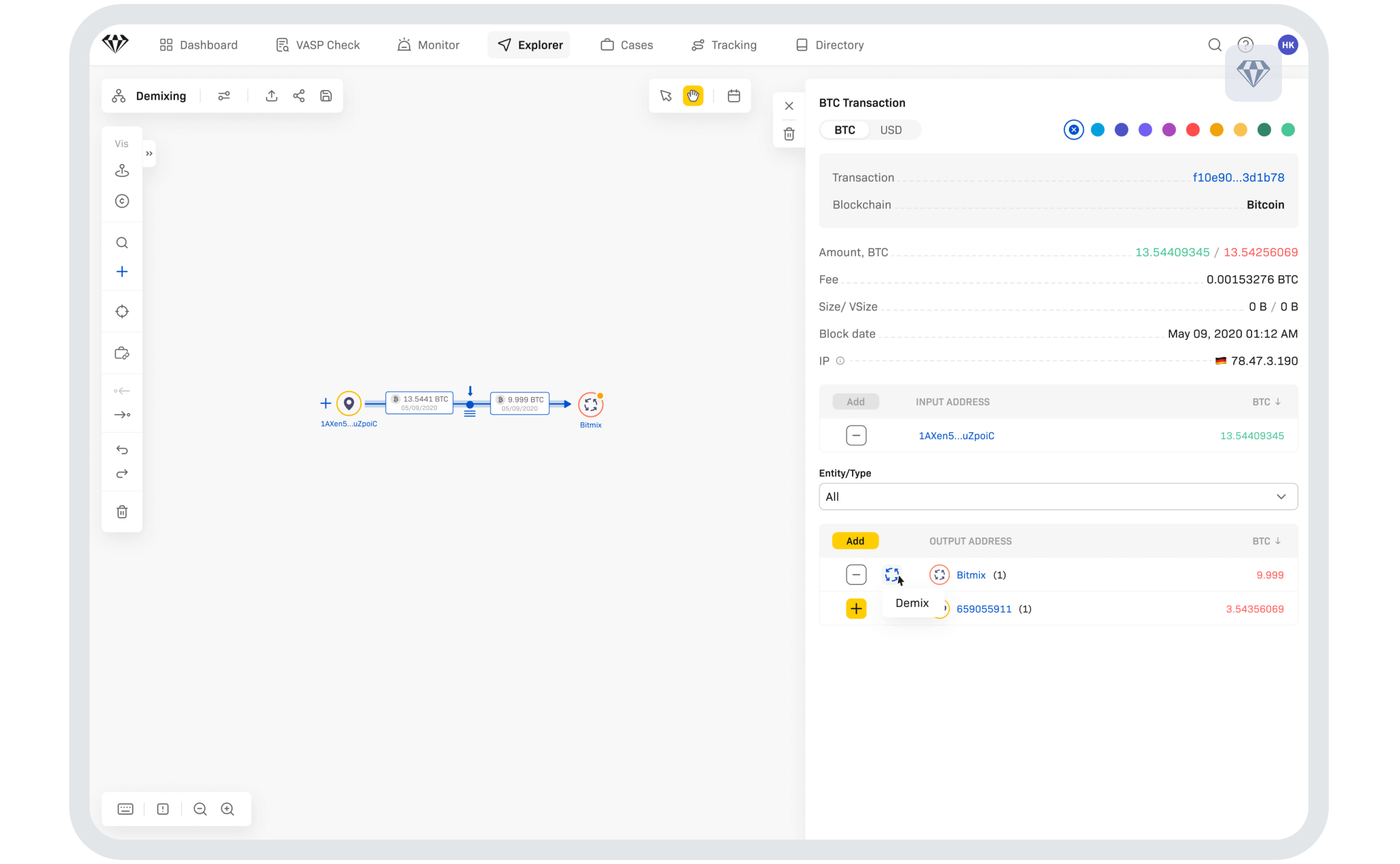 Demixing is available for any transaction where the output is an entity identified as a mixing service—or a related entity.