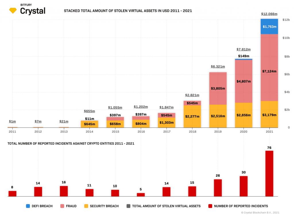 Cryptocurrency crime is growing in parallel with cryptocurrency markets. Approximately $12.1 billion in cryptocurrencies was stolen between Jan 2011 and Dec 2021. There have been 120 security attacks, 73 DeFi protocol exploits, and 33 fraudulent schemes. So far, $3.18 billion has been stolen through security breaches, $7.12 billion through scams, and $1.76 billion through DeFi hacks. In this report, you can explore the largest incidents of stolen funds involving cryptocurrencies over ten years, taking into account the way the incident happened and the volume of funds stolen.