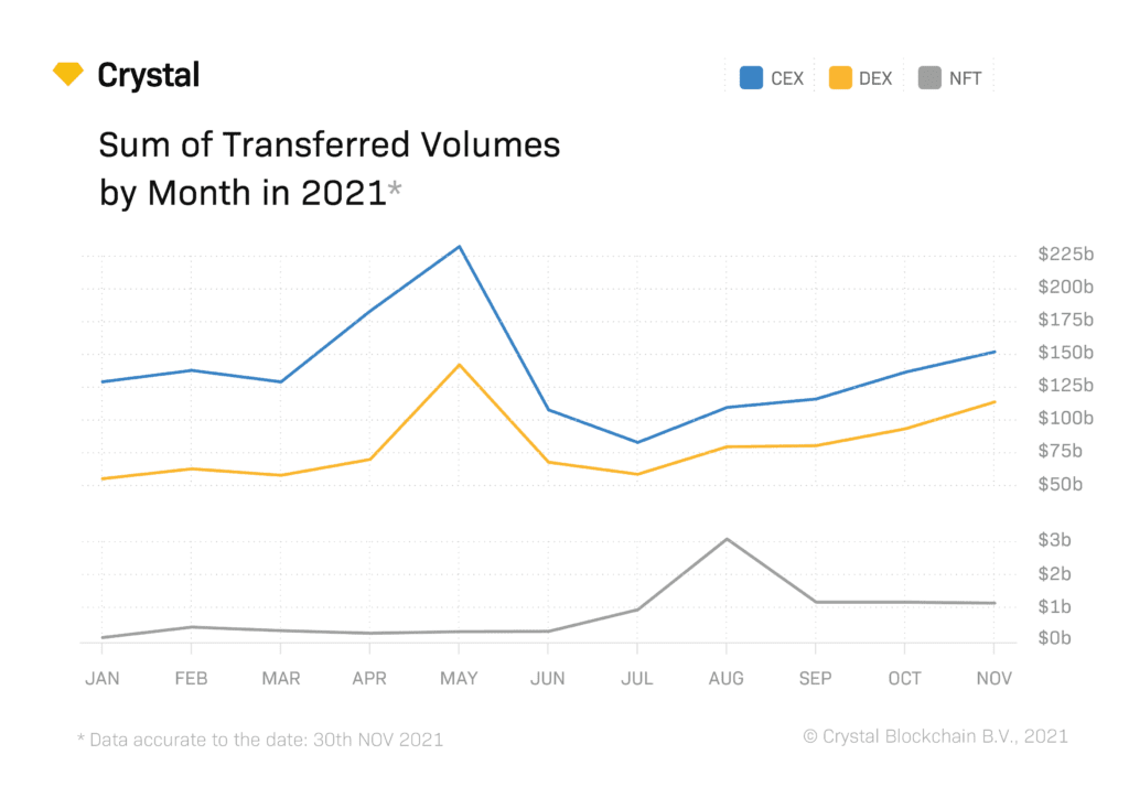Sum of transferred volumes per month 2021 (CEX vs. DEX vs. NFT)