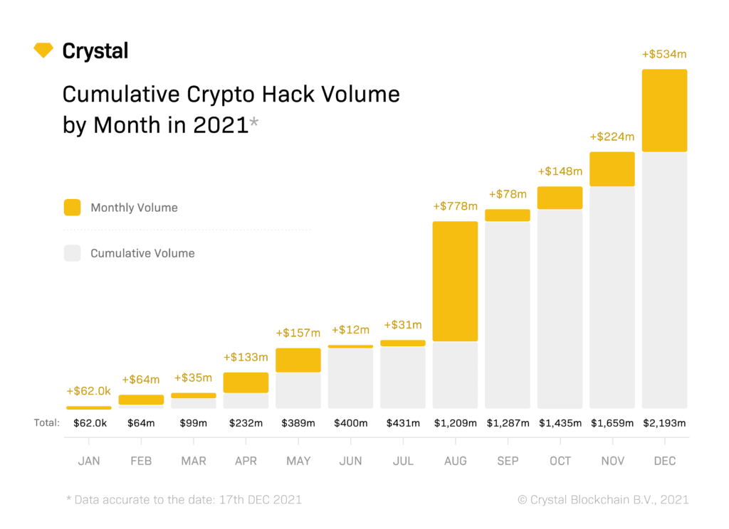 In 2021 we saw the financial damage from an increasing number of hacks in the cryptocurrency industry almost double what it was in 2020. There has also continued to be growing criminal dynamics in the last quarter of 2021. This is a worrying trend that will run into 2022, and we can see in the next section where the damage is happening.