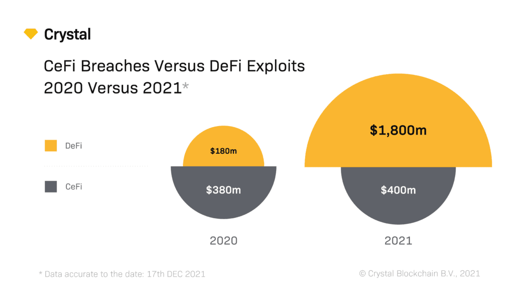 In 2021, we saw a major paradigm shift from 2020, where USD $380 million was stolen via CeFi (centralized finance) or CEXes (centralized exchanges) whereas USD $1,800 million was stolen via DeFi (decentralized finance) or DEXes (decentralized exchanges.)