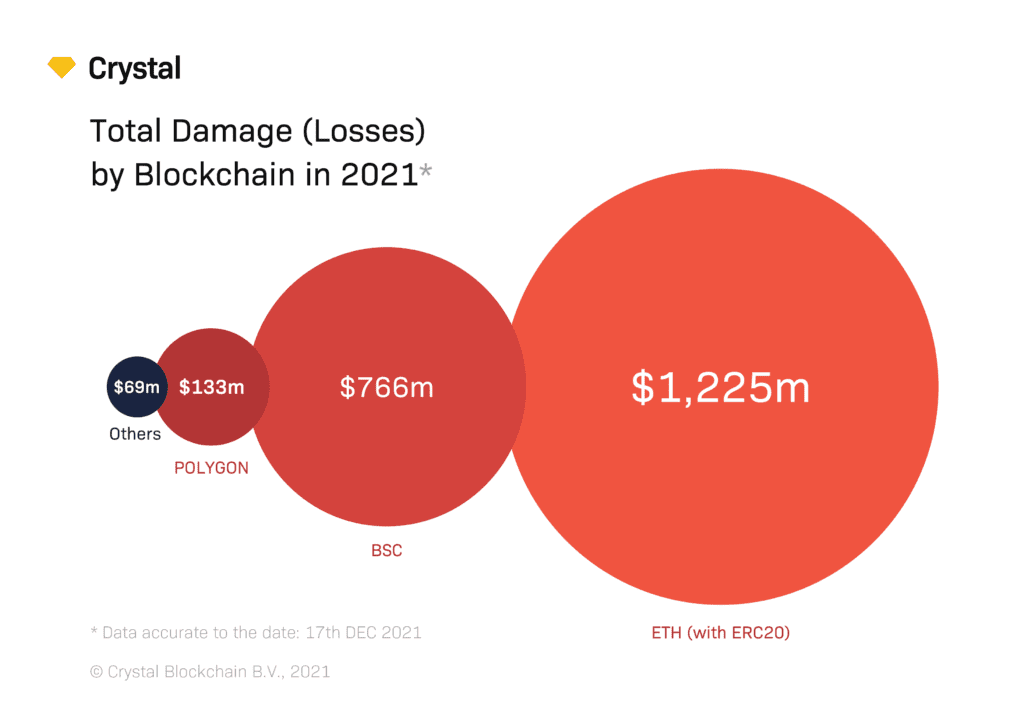Ethereum (with ERC20 tokens) holds the leading position in 2021 at USD $1,225 million. This makes sense considering the amount of increased activity on the Ethereum blockchain, in general, in 2021. Binance Smart Chain comes second in its losses at USD $766 million in 2021, and Polygon comes in third with a loss of USD $133 million.