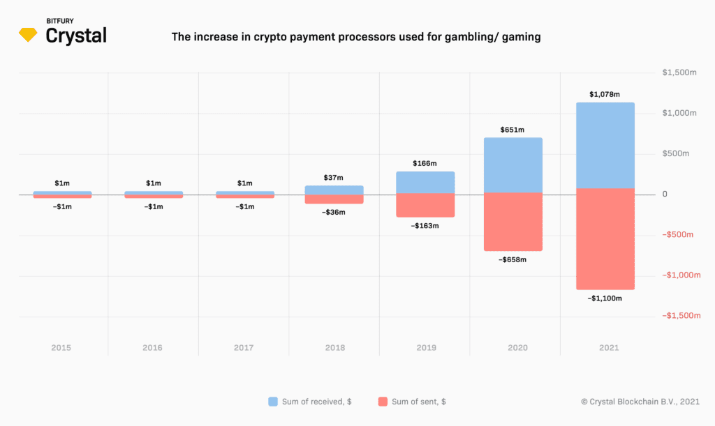 The number of gaming and gambling marketplaces that use payment processors is also on the rise. In 2021, the total value of cryptocurrencies sent via such processors increased by 65.6%.
