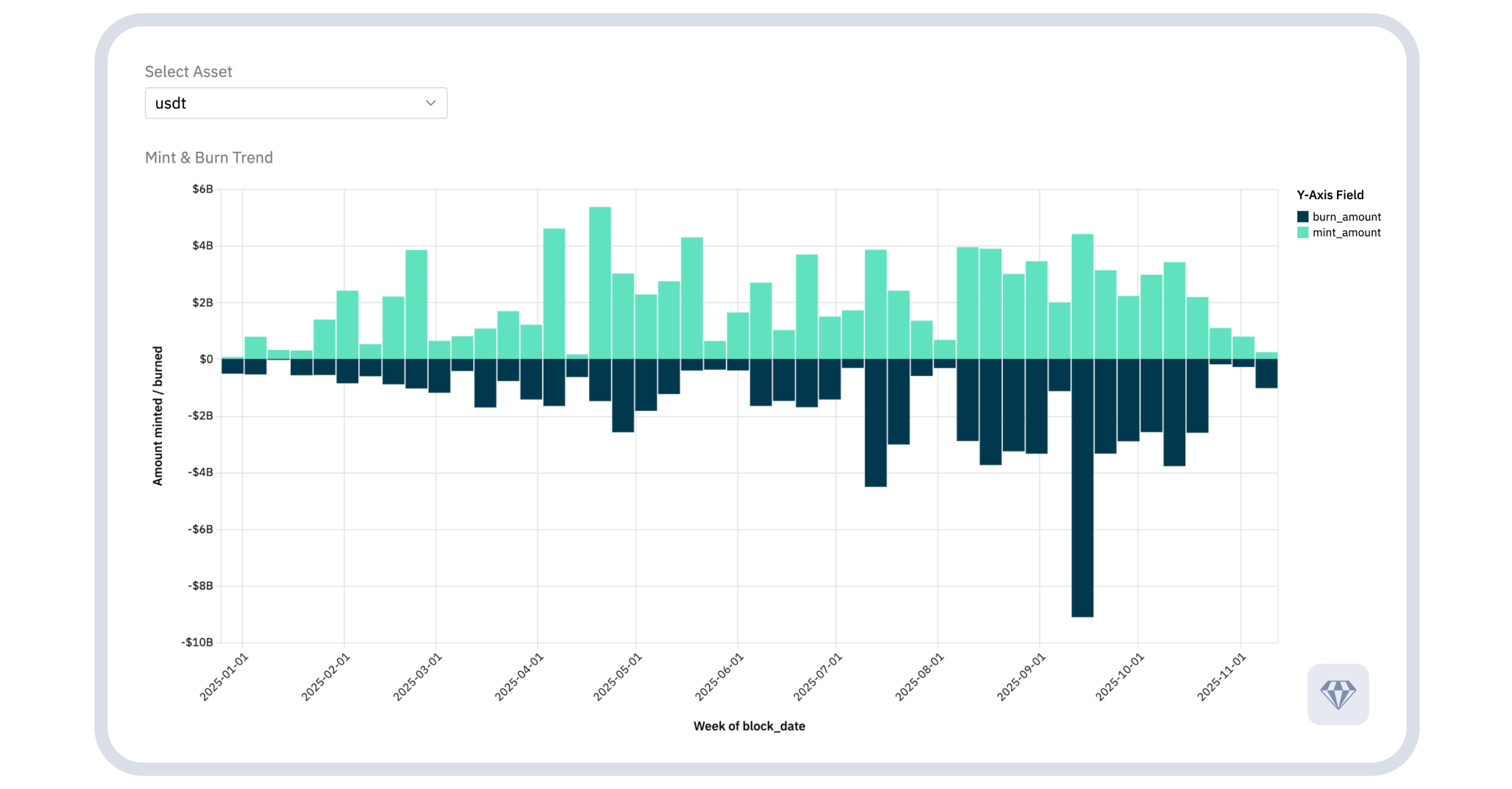 Both stablecoins experienced pronounced burning activity in September 2025. USDC showed net burns exceeding $9 billion in a single week during the month. USDT saw burns surpassing $9 billion.