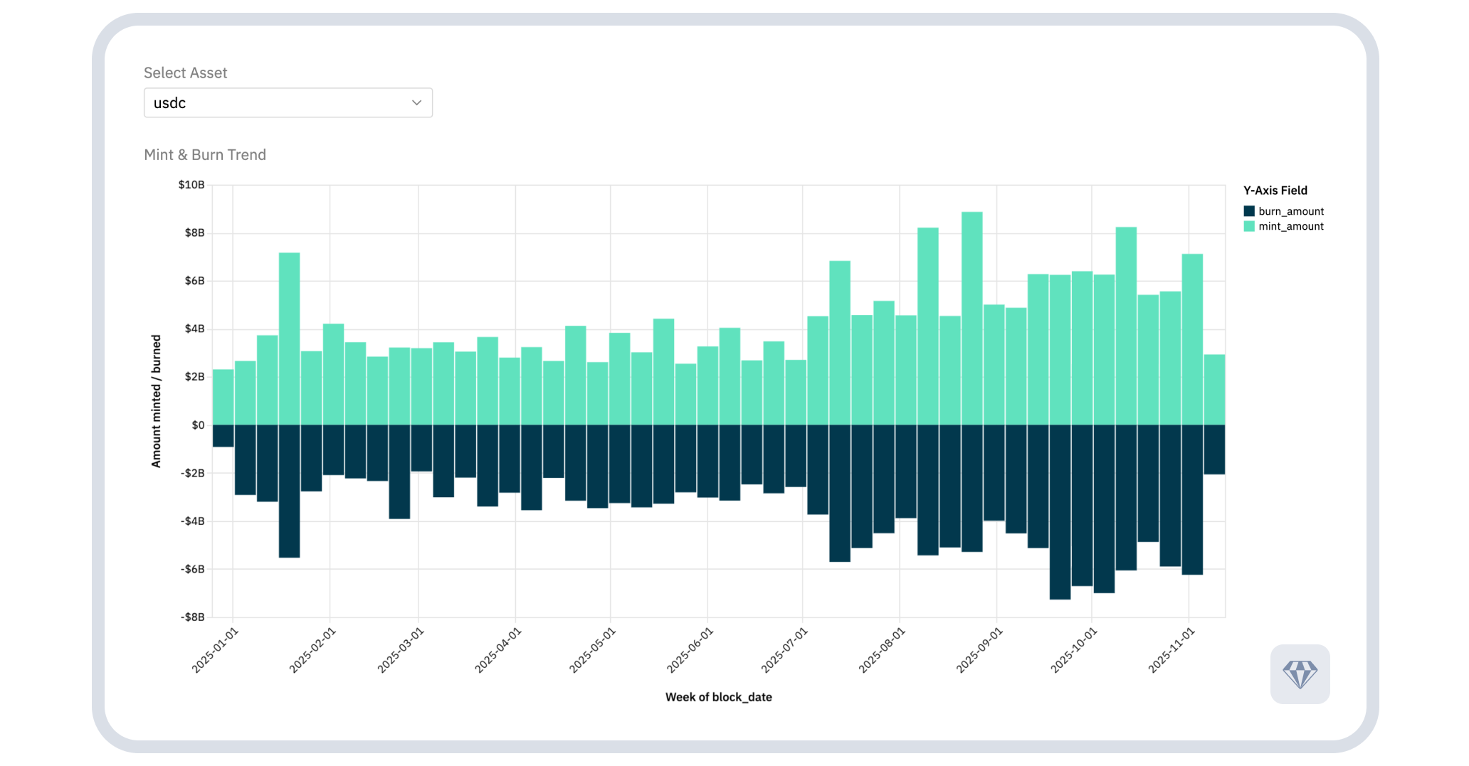 Both stablecoins experienced pronounced burning activity in September 2025. USDC showed net burns exceeding $9 billion in a single week during the month. USDT saw burns surpassing $9 billion.