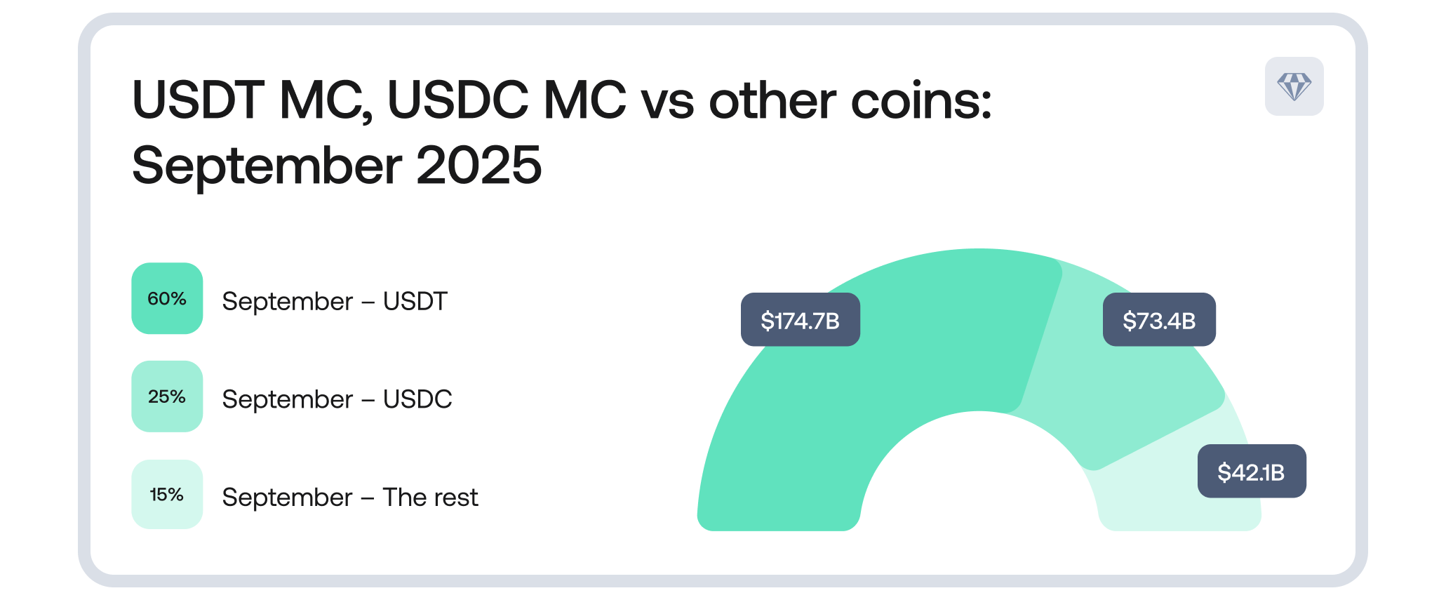 - USDT dominance solidified: closed Q3 at $175B market cap with daily trading volumes 5x larger than USDC ($40-200B vs $5-40B)
