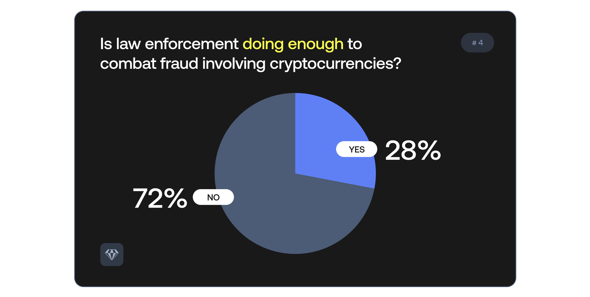 An overwhelming 72% of respondents believe law enforcement is not doing enough to combat crypto crime.
